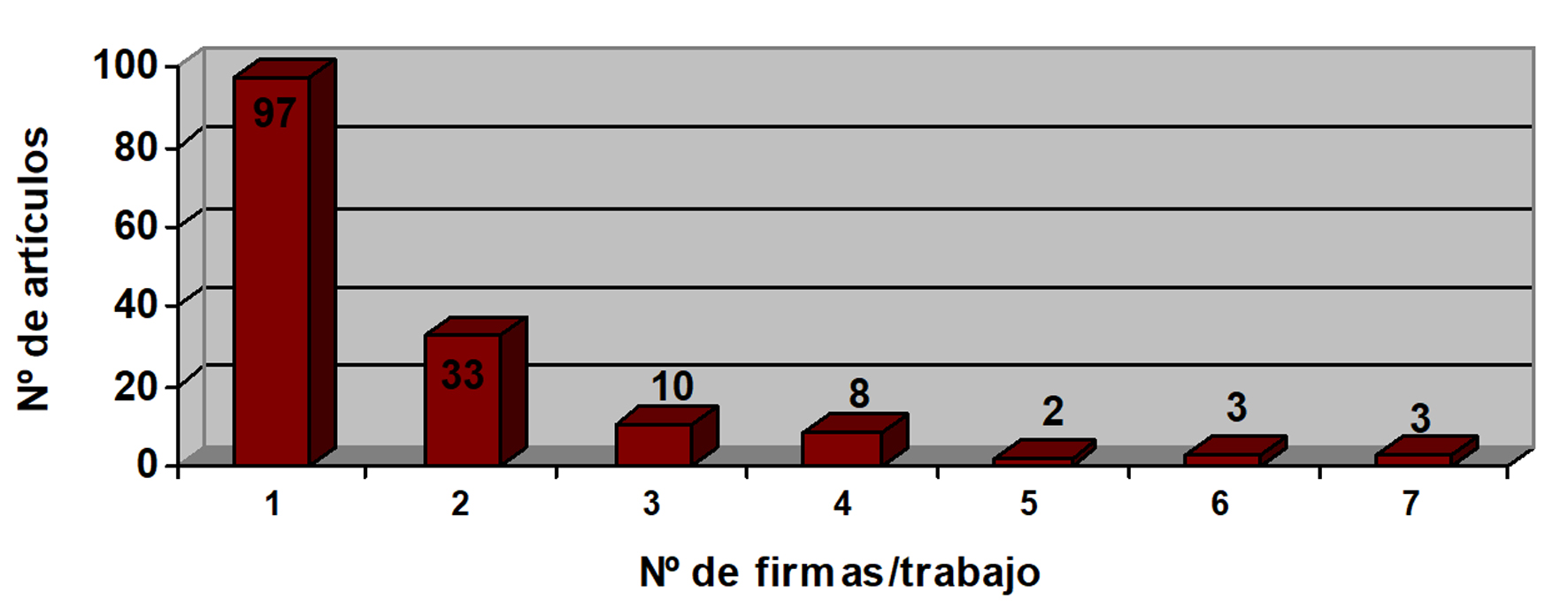 Los 156 documentos editados han sido firmados por un grupo de 138 autores, lo que arroja una media de 1,13 firmas/documento. Es, en verdad, una cifra baja, condicionada en gran medida por el elevado número de artículos que cuentan con una única firma, 97 (62,1%). También es alto el número de documentos que tienen solo dos firmas, 33 (21,1%), lo que hace que el porcentaje de colaboración[6] en los documentos publicados sea escaso, de apenas el 15,3% (24 trabajos). De hecho, sólo hay 2 documentos con cinco firmas, 3 con seis y otros 3 con siete (Figura 2).