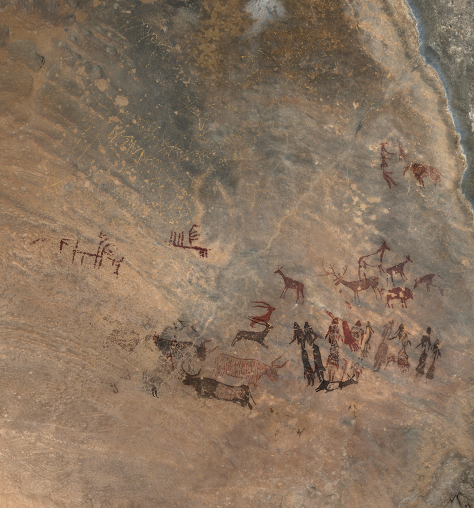 A nuestro parecer, las evidencias relativas a la aplicación de los colores, las superposiciones y el estudio de las composiciones permitirán replantear y afinar el conocimiento sobre el proceso de ejecución del mural. En este sentido, será necesario profundizar en el estudio de las figuras repintadas y restauradas, así como de las bicromías y de los grabados más antiguos —especialmente los anteriores a las pinturas de los bóvidos núm. 12, 20 y 21—, ya mencionados en trabajos precedentes[37] y que consideramos elementos integrantes de la etapa inicial del conjunto rupestre del Cogul.