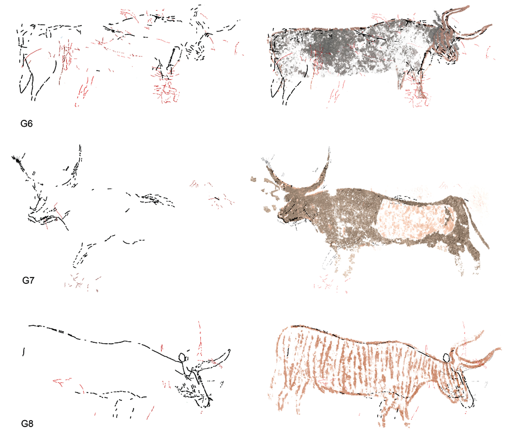 Representación de los grabados G6, G7 i G8 infrapuestos a las pinturas de los bóvidos (núm. 12, 20 y 21). En negro, las líneas relacionadas con las figuras de los toros y en rojo, otras incisiones indeterminadas.