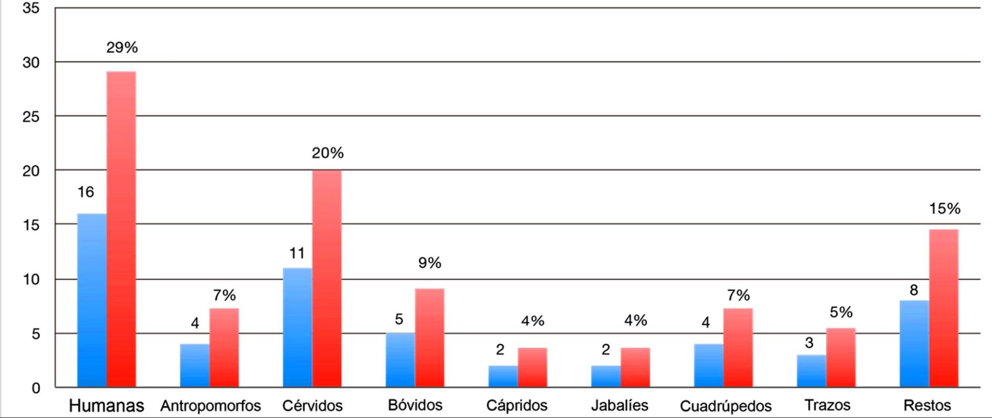 Tipos y porcentaje de los motivos pintados en la Roca dels Moros del Cogul.