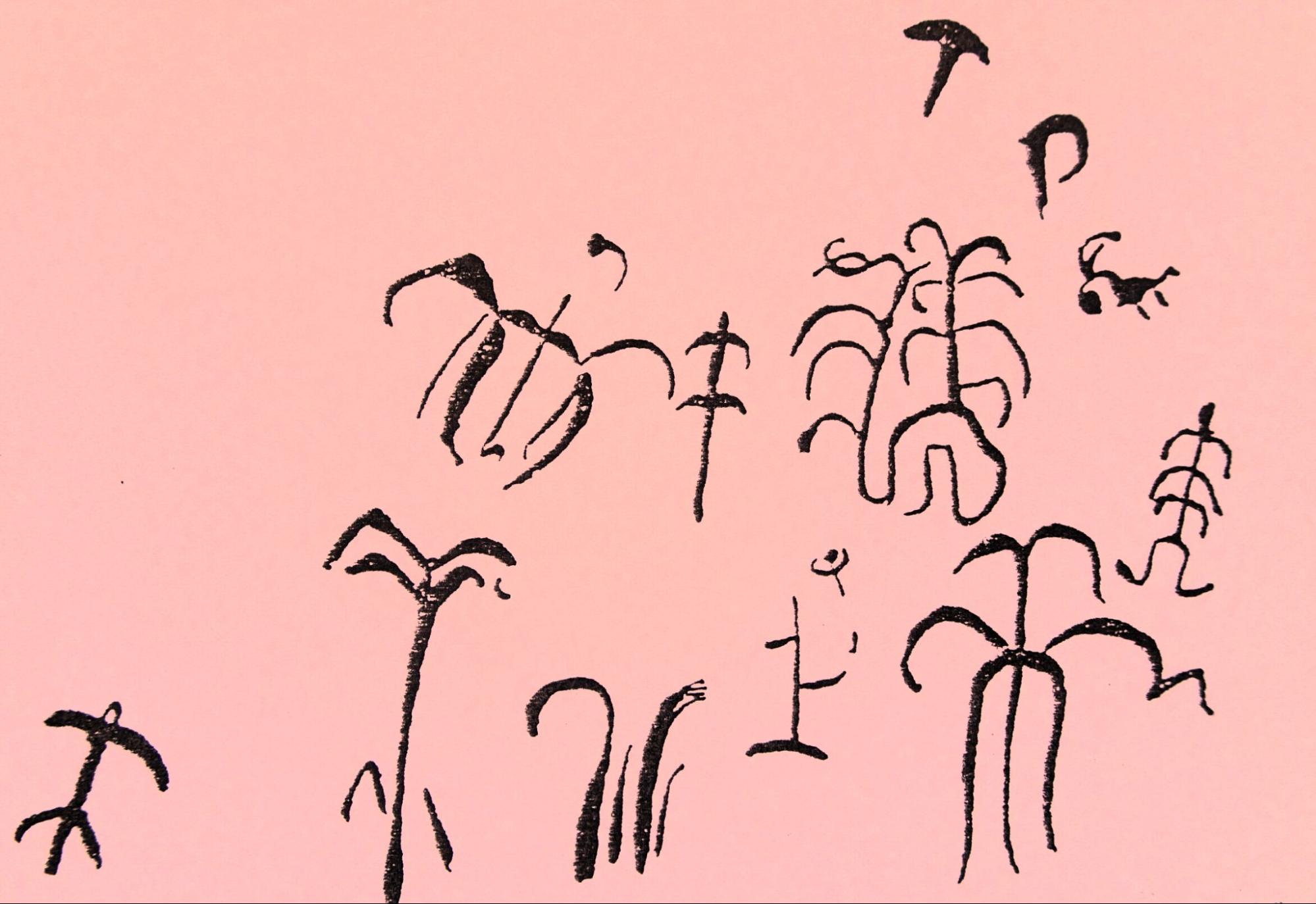 Brujo de la Cueva de los Letreros (Vélez Blanco, Almería). Posible captador y emisor de la fecundidad con ideogramas lunares. Calcos de H. Breuil.