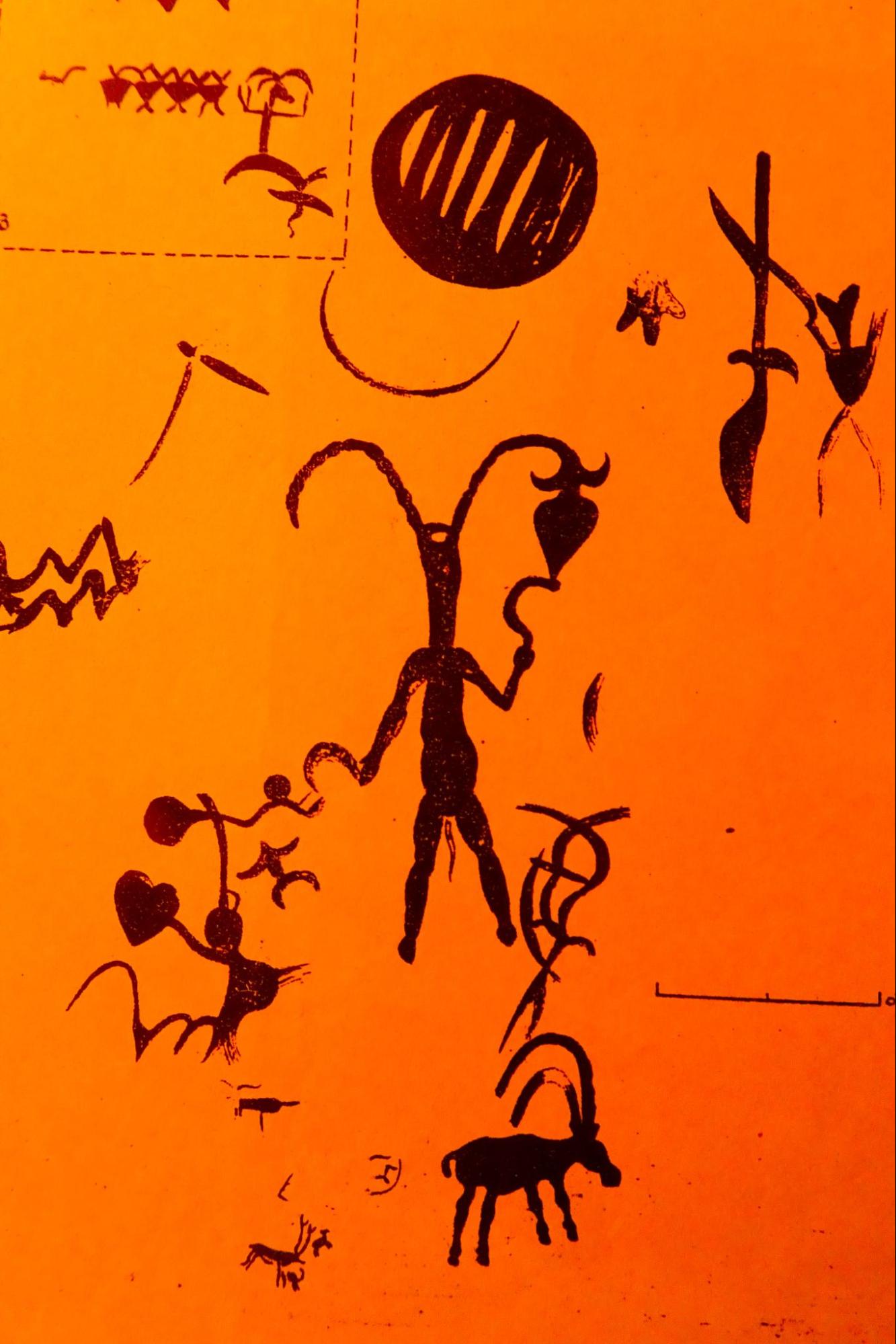 El brujo y las figuras circundantes: columnas de la vida con seres humanos y motivos florales, aguas primordiales, cabras, ciervos esquemáticos…