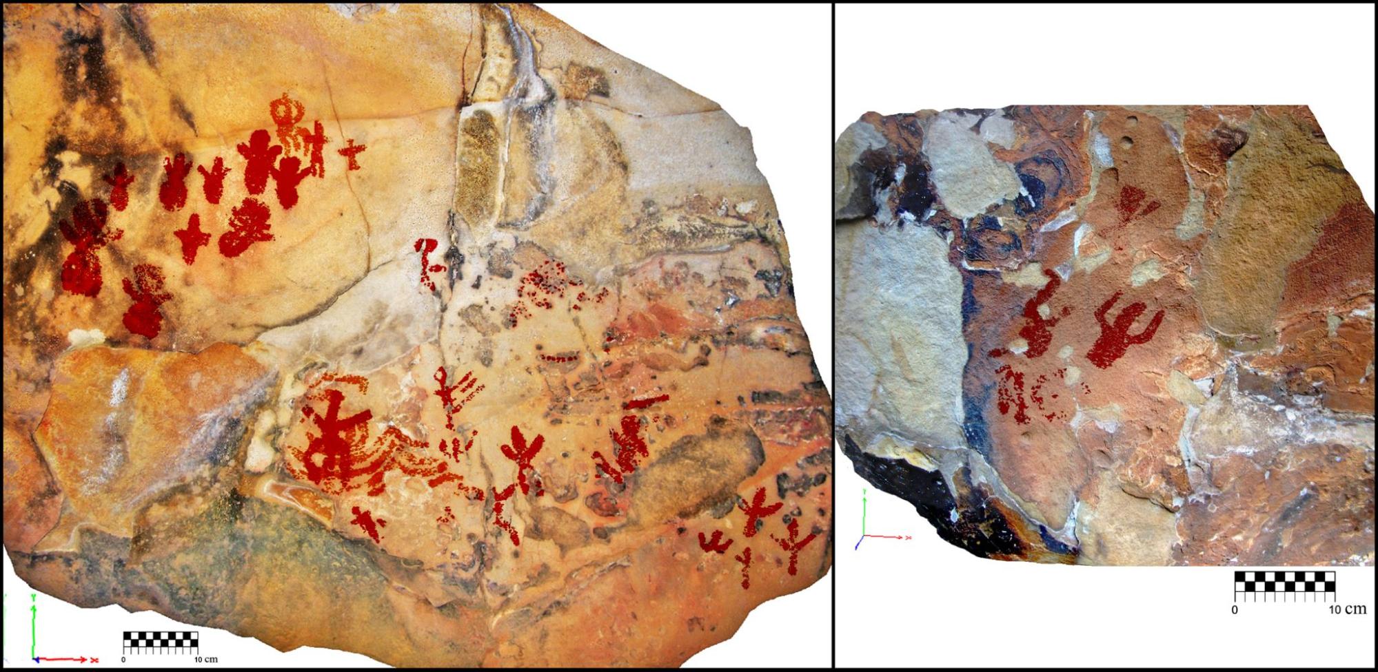 El corpus de figuras que hemos documentado en estas oquedades no solo se adscribe a etapas prehistóricas. Existen cavidades con manifestaciones vinculadas exclusivamente al fenómeno del grafito histórico, desde el Medievo hasta época contemporánea, y paneles donde los grafitis y figuras prehistóricas comparten espacio, técnica de ejecución y parámetros de representación, cuestiones que dificultan su identificación. Respecto a las manifestaciones prehistóricas, son de asignación postpaleolítica, existiendo diferencias entre ellas. Algunas son de tendencia naturalista con parámetros de representación semejantes a los encontrados en el Tajo de las Figuras; otras tienen un diseño acorde a las facies del A.R.E., es decir, ejecución con trazos simples, animales con pocos detalles, signos de difícil interpretación, alto grado de abstracción... En ocasiones, estos estilos conviven en las estaciones (Figura 3). Centramos nuestra investigación en un conjunto de emplazamientos que presentan una homogeneidad entre sus paredes decoradas. Son paneles monotemáticos que se configuran con una iconografía compartida basada en antropomorfos, bitriangulares y halterioformes, de brazos alzados. La agrupación e interacción de estas figuras conforma unas composiciones escénicas que manifiestan la reproducción de determinadas costumbres o cultos, ofreciéndonos una imagen de la sociedad en la que se enmarcan. En muchos de estos lienzos se dibujaron figuras alegóricas, con multiplicidad de brazos, reflejo del mundo espiritual o místico de unas comunidades que prosperaron en este entorno durante la Prehistoria Reciente.