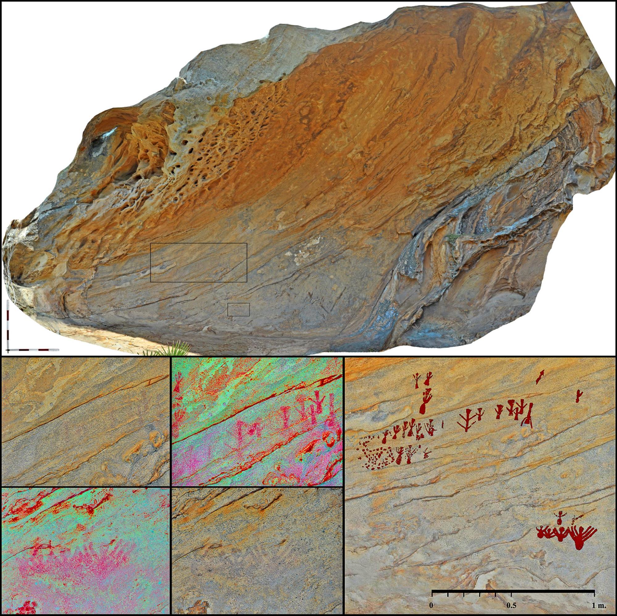 Las figuras se concentran en la zona de máxima profundidad, lateral izquierdo, ocupando 1,5 m2 de pared. En la parte central de la oquedad existen descamaciones naturales en las que no detectamos restos de pintura. En el apartado de deterioro por daños antrópicos no hay que lamentar pérdida patrimonial, no se evidencian huellas de visitas incontroladas ni de actividades asociadas a la explotación de estas sierras (carboneros, corcheros, pastores…), es un espacio poco frecuentado y de escaso provecho para estos colectivos. Respecto al panel pictórico, la mayoría de las figuras están completas, contrastan poco con la superficie rocosa y se constata abrasión eólica en la zona superior del lienzo. A lo que hay que añadir un soporte oscurecido, por contener una alta concentración de minerales de cementación, que limita aún más su visualización. Breuil y Burkitt solo pudieron documentar 16 manifestaciones, desde entonces no ha habido nuevos estudios y actualización de registros[15]. Nuestra exploración digital nos ha revelado una serie de puntos y motivos figurativos. Estos últimos son de adscripción iconográfica al A.R.E. e identificables con antropomorfos, aunque reflejan distintas variantes gráficas para su representación. En la parte superior del panel distinguimos sesenta digitaciones y veintiuna figuras: catorce son clasificables como bitriangulares antropomorfos, tres poseen cabeza triangular y cuerpo de trazo simple, una tiene cuerpo triangular y cabeza circular. En la parte inferior solo encontramos seis motivos, cinco de cuerpo ovalado o globular y uno de trazo simple conservado parcialmente. Estamos ante dos grupos de motivos independientes que presentan diferencias en ubicación, diseño y tonalidad, cuestiones que nos advierten de, al menos, dos momentos de ejecución.