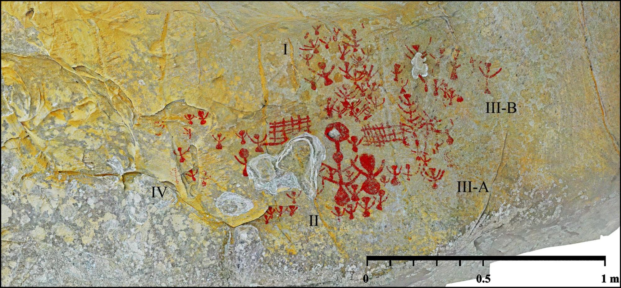 El sector III lo dividimos en dos composiciones que muestran una estructura similar a la anterior, es decir, poseen una figura destacada y antropomorfos a su alrededor. El primer subconjunto (III-A) tiene como figura principal un alargado motivo, de cinco pares de apéndices, acompañado de representaciones humanas situadas por debajo y a su derecha. También se observa en la parte inferior una figura alegórica con doble brazo y un signo, parcialmente conservado y de trazo fino, constituido por dos círculos concéntricos y peana. Estos dos motivos no tienen correspondencia en las otras unidades de contenido que aparentan representar lo mismo; ignoramos su carácter simbólico en la escena. De hecho, en el segundo subconjunto (III-B) no aparecen estas manifestaciones y su figura principal, con doble o triple par de apéndices, en parte mutilados por descamación de soporte, se acompaña con antropomorfos dispuestos a derecha e izquierda a menor cota. En la sección izquierda del soporte posicionamos el sector IV, donde detectamos nueve figuras humanas sueltas o en pequeñas agrupaciones y tres motivos con doble par de brazos parcialmente conservados. Dos de estas figuras alegóricas se han incorporado al panel con posterioridad; poseen un grosor de trazo y diseño distinto que el resto. De esta forma, su autor o autores han logrado variar el patrón inicial, consiguiendo una mezcla de motivos, alegóricos y humanos, sin aparente orden y carente de figura principal. Regla de combinación observable en otra unidad de contenido de esta cavidad y en la Rosa.
