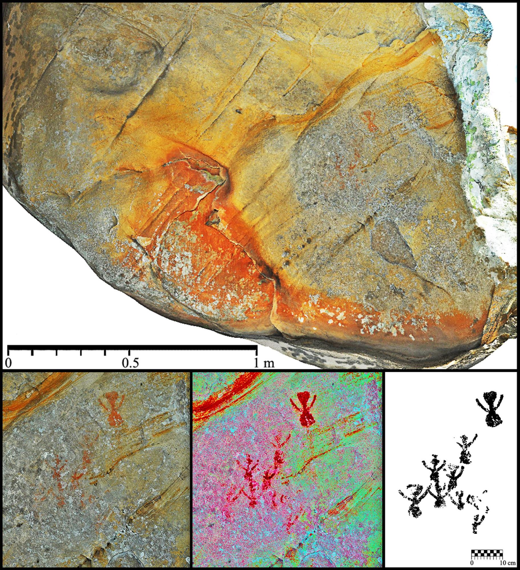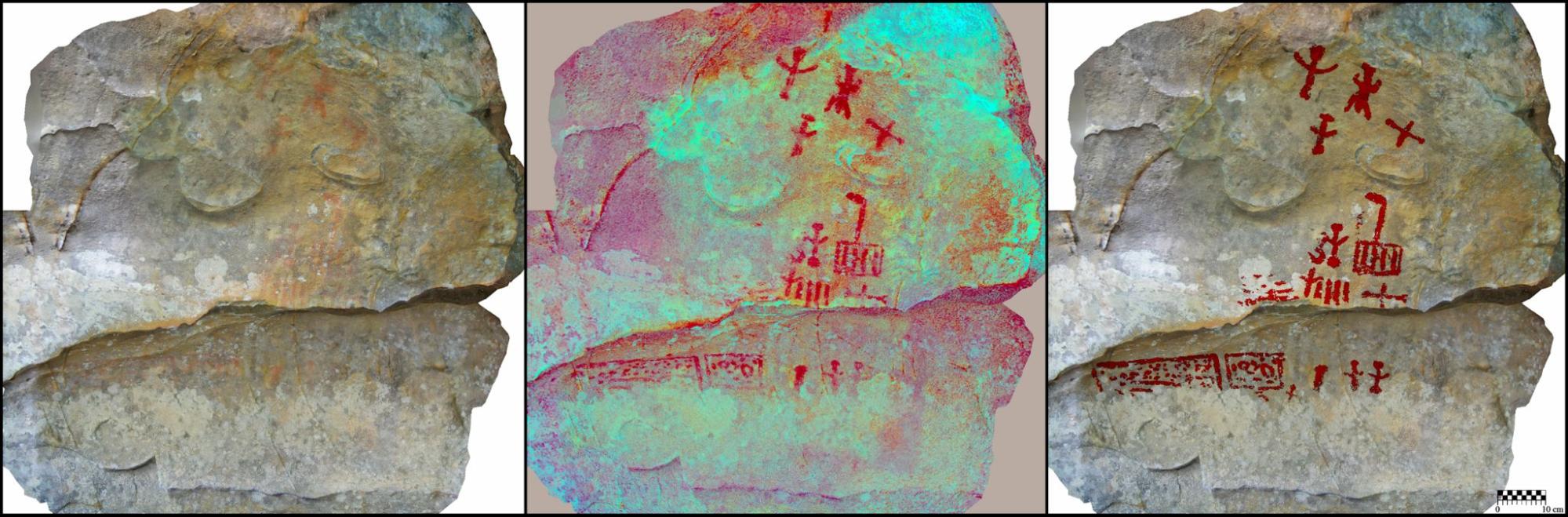 Ortofoto, imagen tratada y calco del panel principal de la cueva de Canuto Ciaque II (Medina Sidonia, Cádiz). (Fuente propia).
