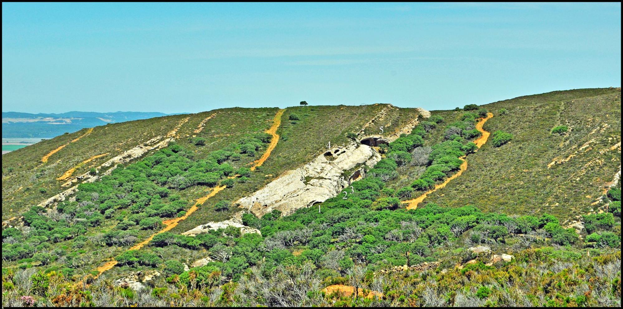 Vista de las cuevas en el canuto del Avancejo desde el cerro del Corzo: 1.- Canuto del Avancejo I, 2.- Canuto del Avancejo II. 3.- Canuto del Avancejo III, 4.- Mujeres II, 5.- Mujeres o Ahumada. (Elaboración propia).